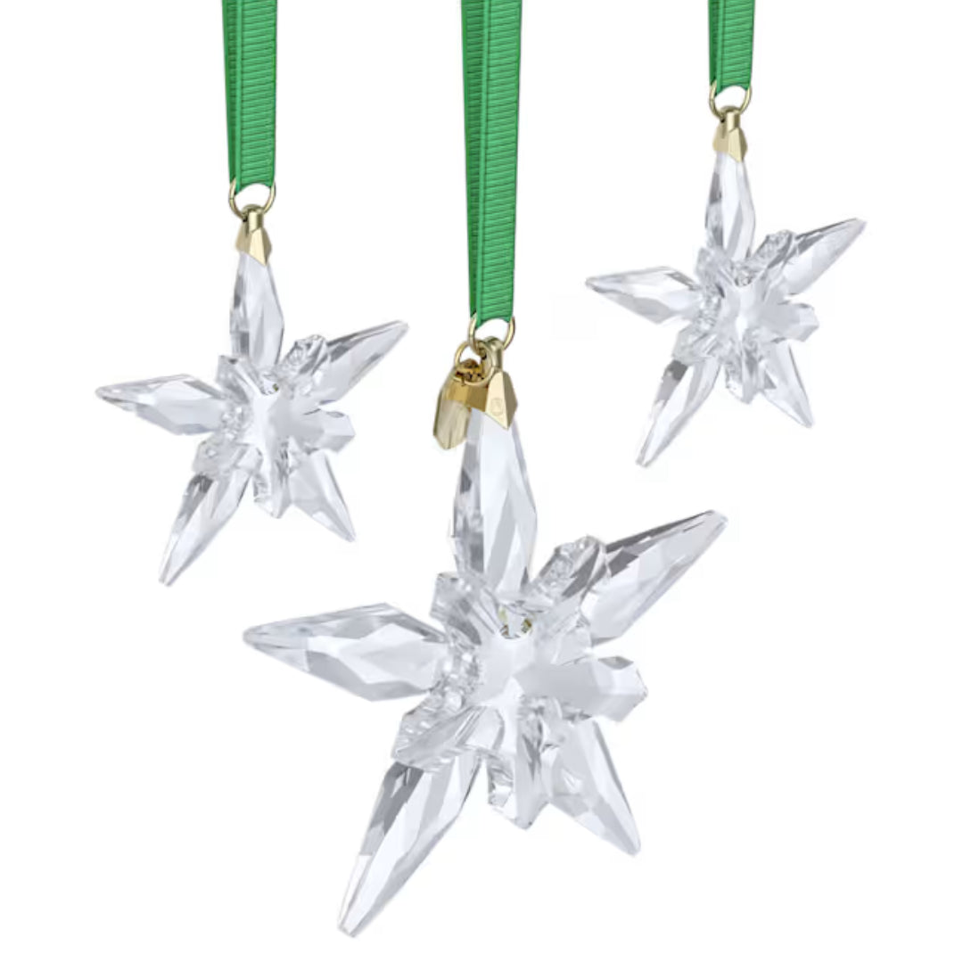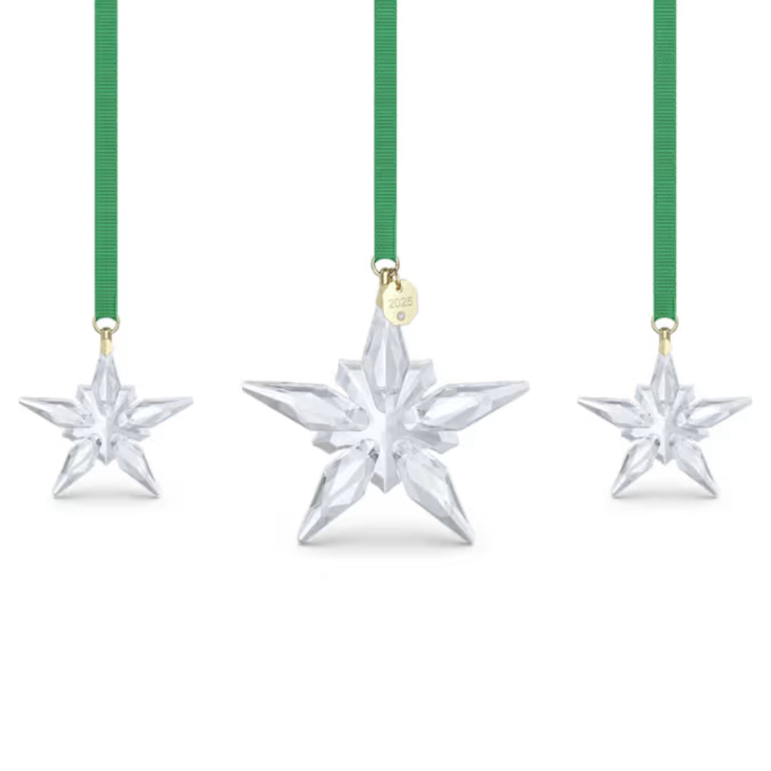 This magical holiday set continues the iconic tradition of Swarovski's Annual Edition Ornaments. The set features three clear stars, crafted with a total of 570 facets, that are inspired by the serenity of the night sky. Each star is suspended from a green grosgrain ribbon with champagne gold-tone plated accents, while the large star also includes a 2025 engraving on the tag. Designed especially for the festive season, this commemorative set would make a truly elegant gift or take pride of place in your own festive décor. Decoration object. Not a toy. Not suitable for children under 15.